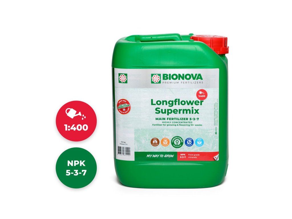 BioNova LongFlower Supermix je efektívne jednozložkové minerálne hnojivo vhodné pre rastliny, ktoré prechádzajú dlhou fázou kvitnutia a majú nízke požiadavky na dusík. Toto hnojivo je ideálne pre celý rastový cyklus a obsahuje vyvážené množstvo všetkých kľúčových živín potrebných pre optimálny rast a kvetenie rastlín.