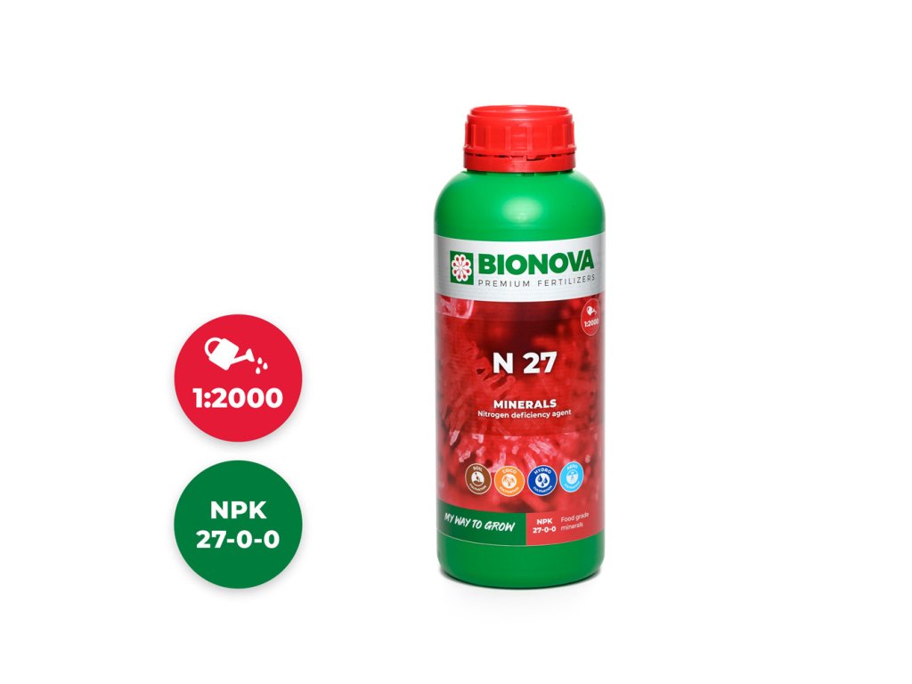 N 27 by mal byť použitý, keď dôjde k nedostatku dusíku alebo keď chcete stimulovať rast rastlín. Tento produkt je možné kombinovať so všetkými hnojivami Bionova, stimulátormi, minerálmi, univerzálnymi a substrátmi. N 27 môže byť použitý ako na zavlažovanie, tak na postrek na listy.
