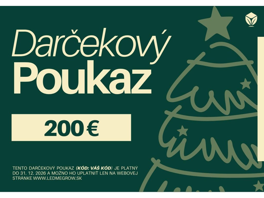 Nie ste si istí, čo potrebujú vaši známi? Nerobte si starosti a darujte im darčekový poukaz v hodnote 200 €, aby si mohli zakúpiť pestovateľské vybavenie podľa vlastného výberu. Poukaz je možné použiť na celý náš sortiment a je platný do konca roka 2026. Poukaz vám bude doručený s kódom na zľavu e-mailom a tiež vytlačený v balíku, ak objednávate viac tovaru.