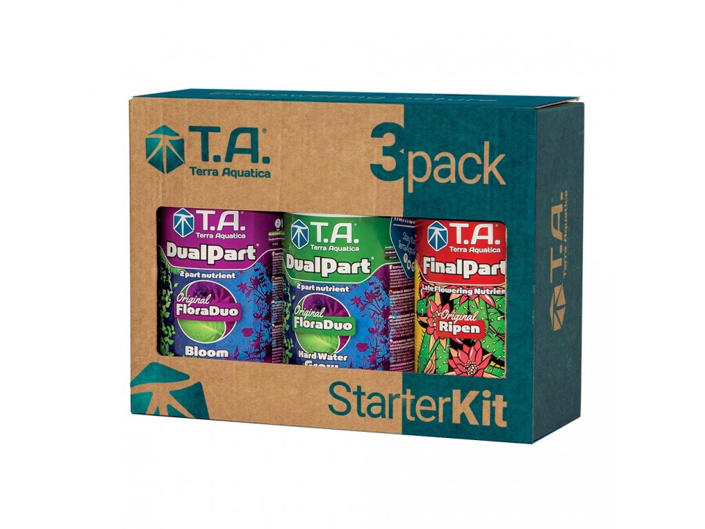 FloraDuo Series - trojbalení, ktoré predstavuje ideálny štartovací set. Balenie obsahuje: 500ml FloraDuo Grow, 500ml FloraDuo Bloom, 500ml Ripen, pH Test Kit a pH Down Dry.Tento set je určený pre tvrdú vodu.