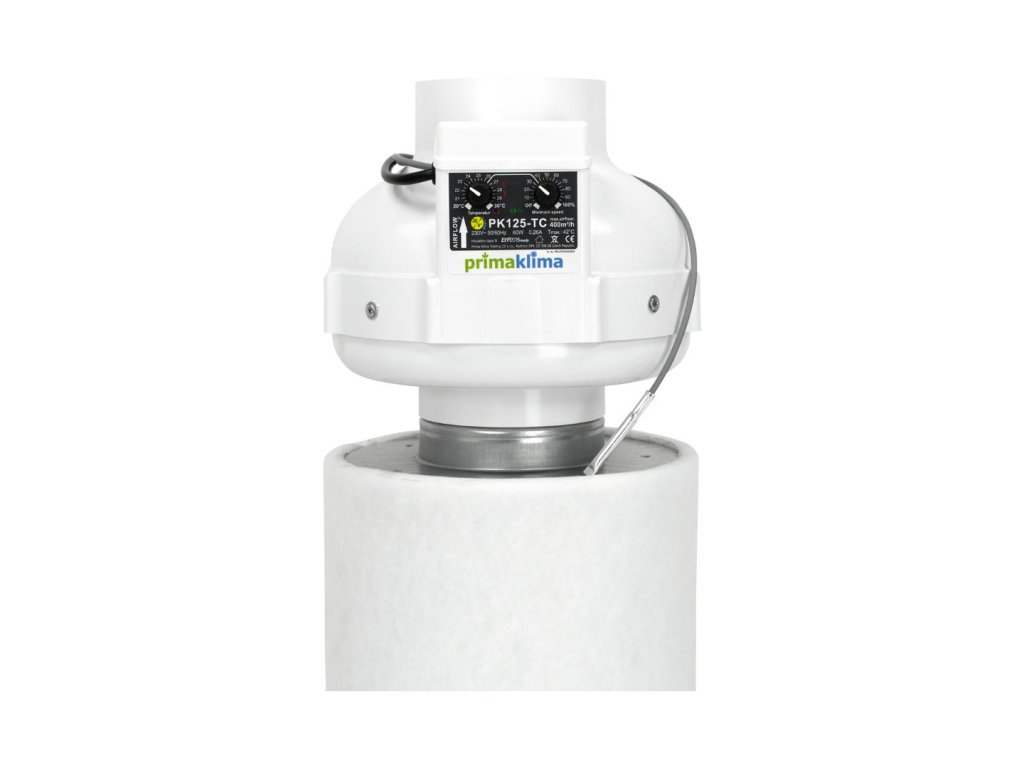 Primaklima Kombo-Kit PK125-TC s teplotne ovládaným ventilátorom a uhlíkovým filtrom Eco line K2601-flat-125 ponúka tichý a veľmi účinný odtok vzduchu. Maximálny prietok vzduchu je až 400 m3/h, takže bez problémov zvládne aj väčšie pestovateľské priestory. Vďaka automatickej regulácii otáčok podľa teploty udržuje stabilné klima a efektívne eliminuje zápachy.