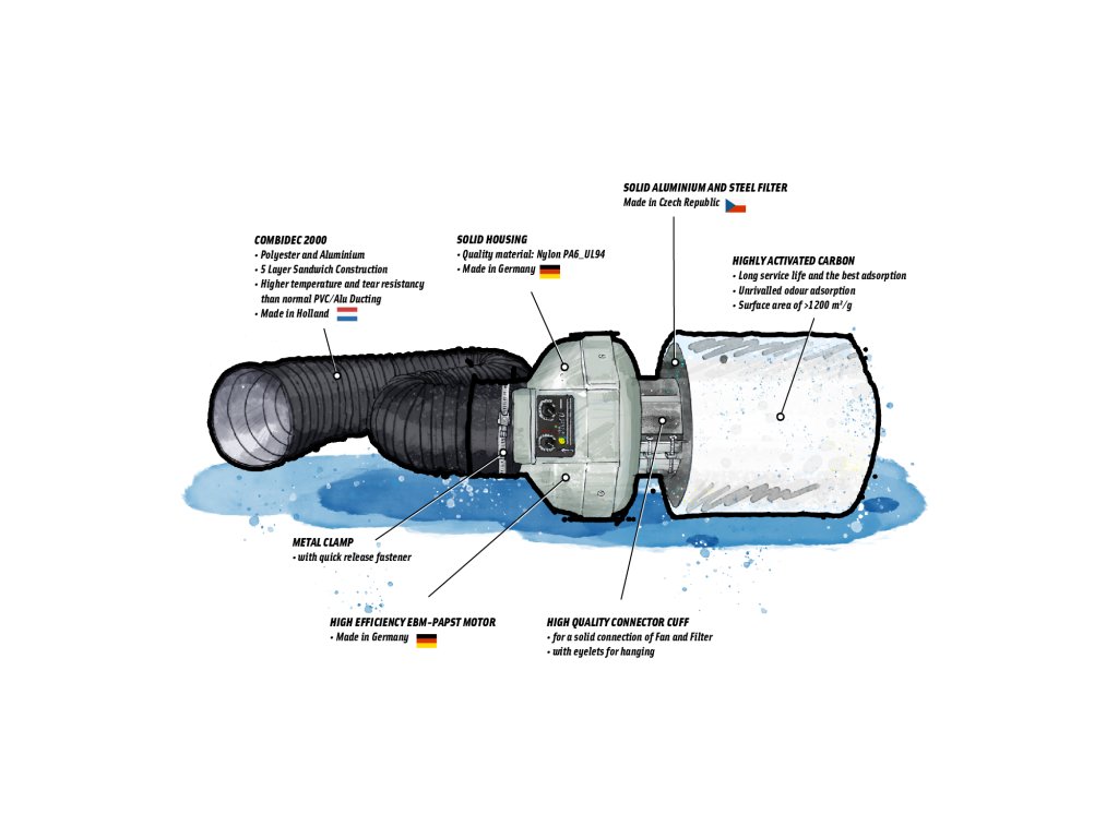 Prima Klima Ventilation Set s kombináciou ventilátora PK100-TC riadeného teplotou a filtru K2600-100 s aktívnym uhlím. Súčasťou je tiež 3m vzduchová rúra, kovová sponka a spojka. Maximálny prietok vzduchu až 280 m3/h. Efektívny a tichý systém ventilácie pre váš priestor.