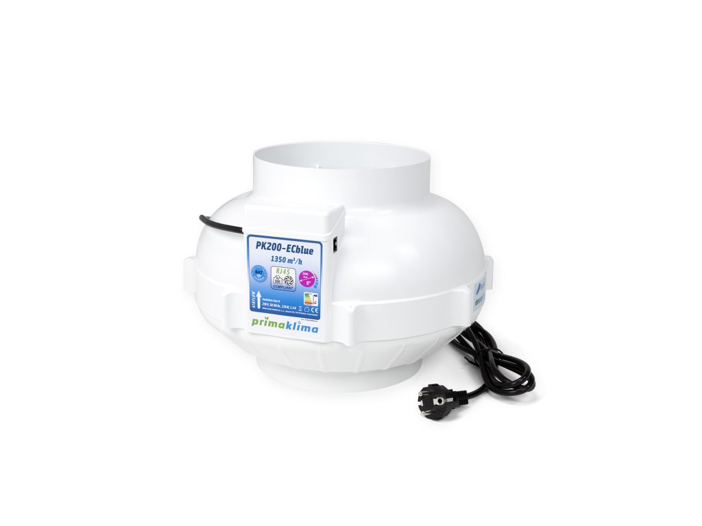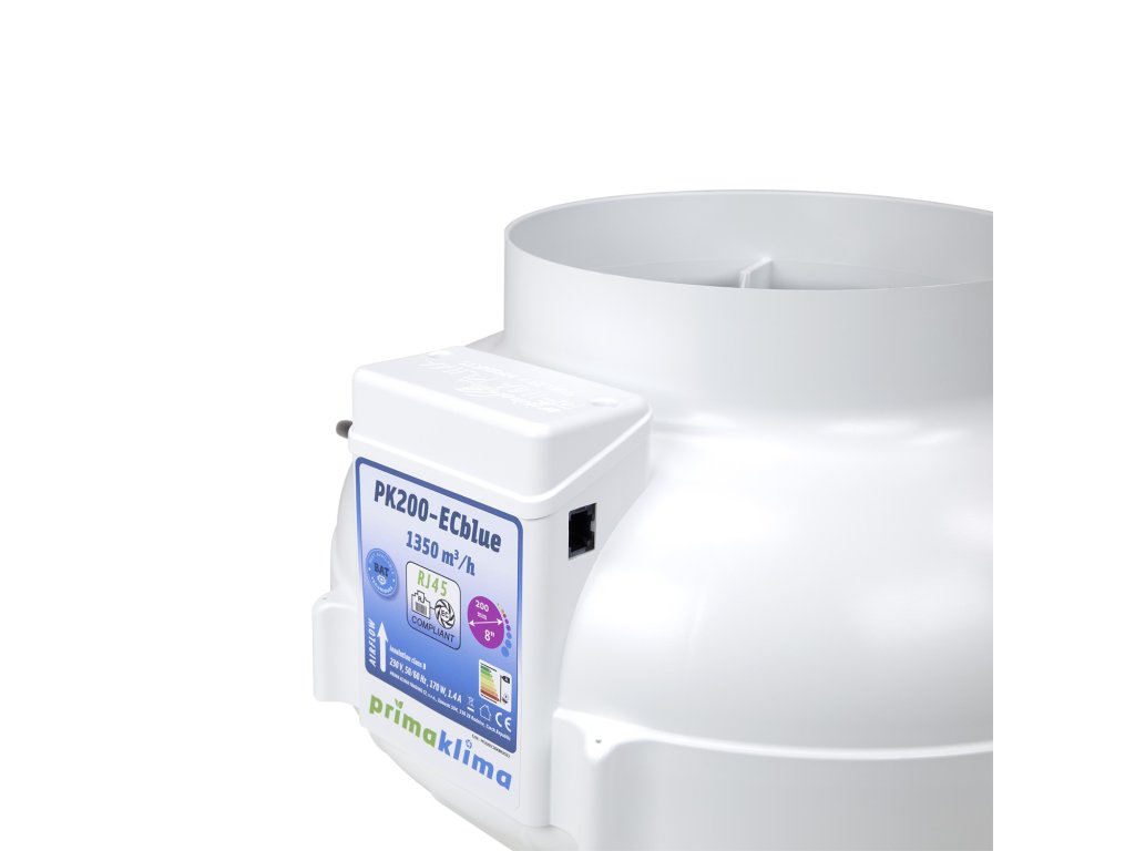 Prima Klima PK200-ECblue je vysoko efektívny inline potrubný ventilátor s priemerom 200 mm, vybavený EC motorom od spoločnosti ebm-papst s lopatkami zakrivenými dozadu. Ventilátor poskytuje maximálny prietok vzduchu až 1350 m3/h pri nízkej spotrebe energie a tichom chode.