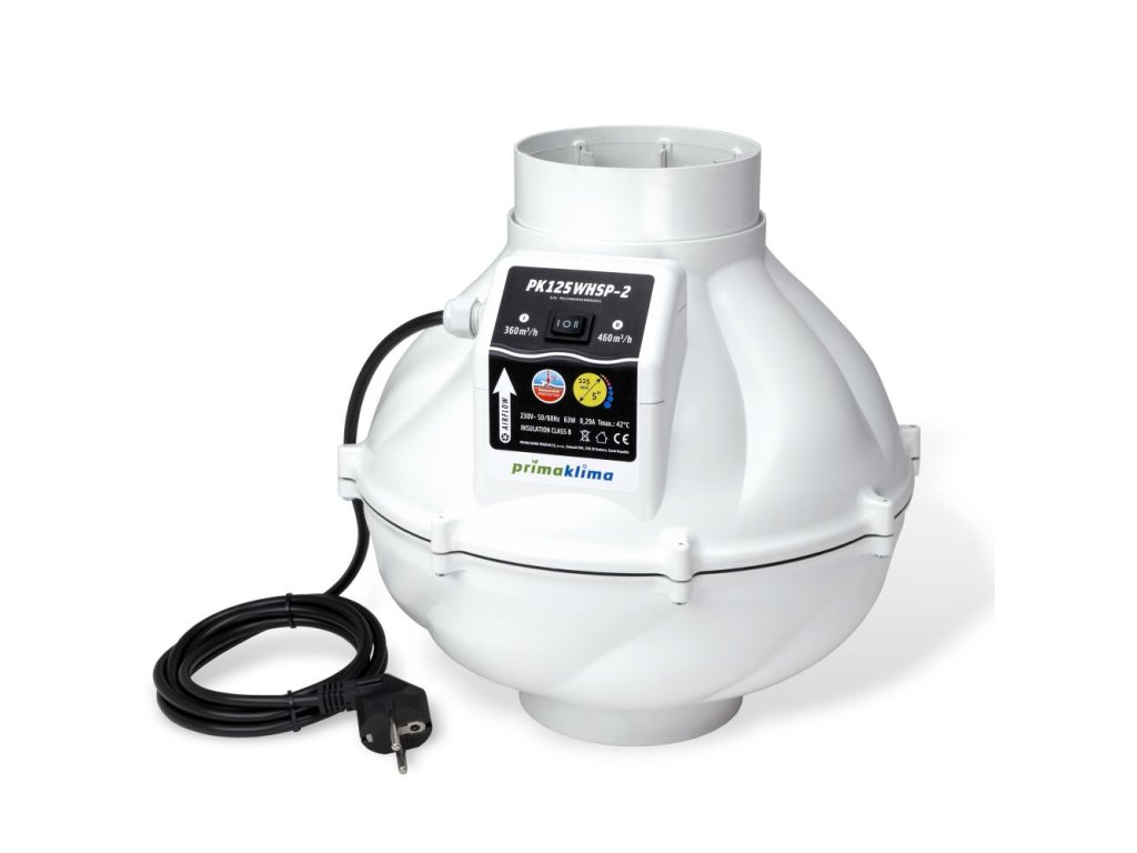 Ventilátor PK125WHSP-2 je dvojrýchlostný s maximálnym prietokom vzduchu až 460 m3/h. Má prírubu o priemere 125 mm a je napájaný striedavým prúdom 230 V pri príkone 63 W. Vďaka teplotnej ochrane je prevádzka bezpečná až do 50 °C. Je kompaktný, s rozmermi 315 × 309 mm a hmotnosťou 2,73 kg (celkovo 4,43 kg). Tento ventilátor je ideálny pre efektívnu a tichú ventiláciu v menších priestoroch.
