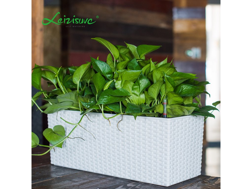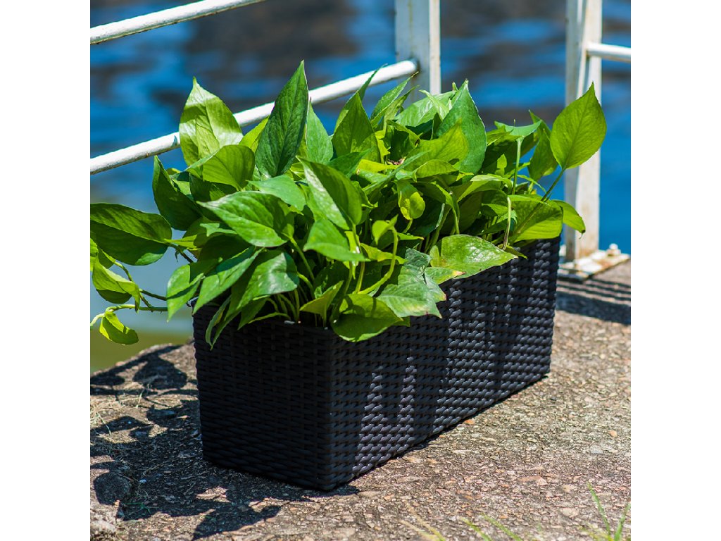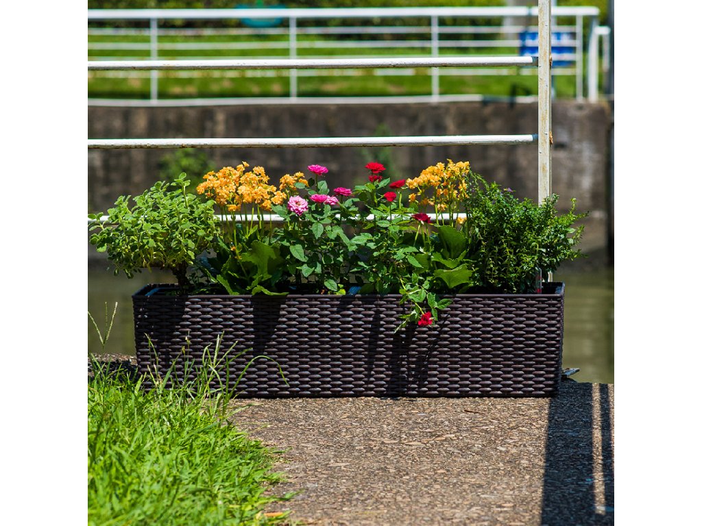 Dizajnový samo-zavlažovací kvetináč v hnedom odtieni s dekoratívnym prepletom. Vhodný na balkón aj do exteriéru. Plavák v kvetináči vám nepretržite ukazuje hladinu vody v nádobke. Vďaka samo-zavlažovaniu nemusíte mať obavy z preliatia – rastliny si vezmú presne toľko vody, koľko potrebujú, a podľa plaváka vždy vidíte, koľko vody zostáva a kedy je potrebné doplniť zalievanie.