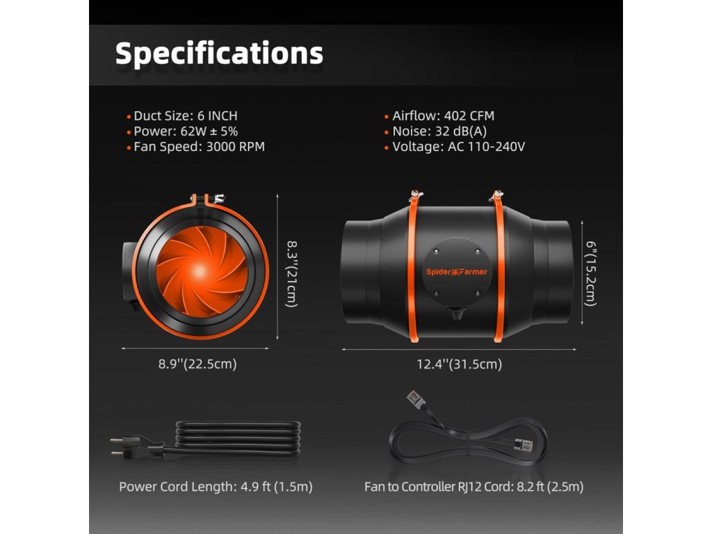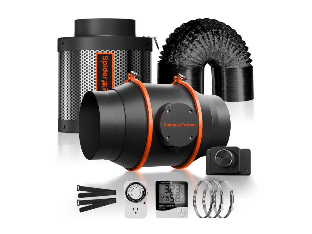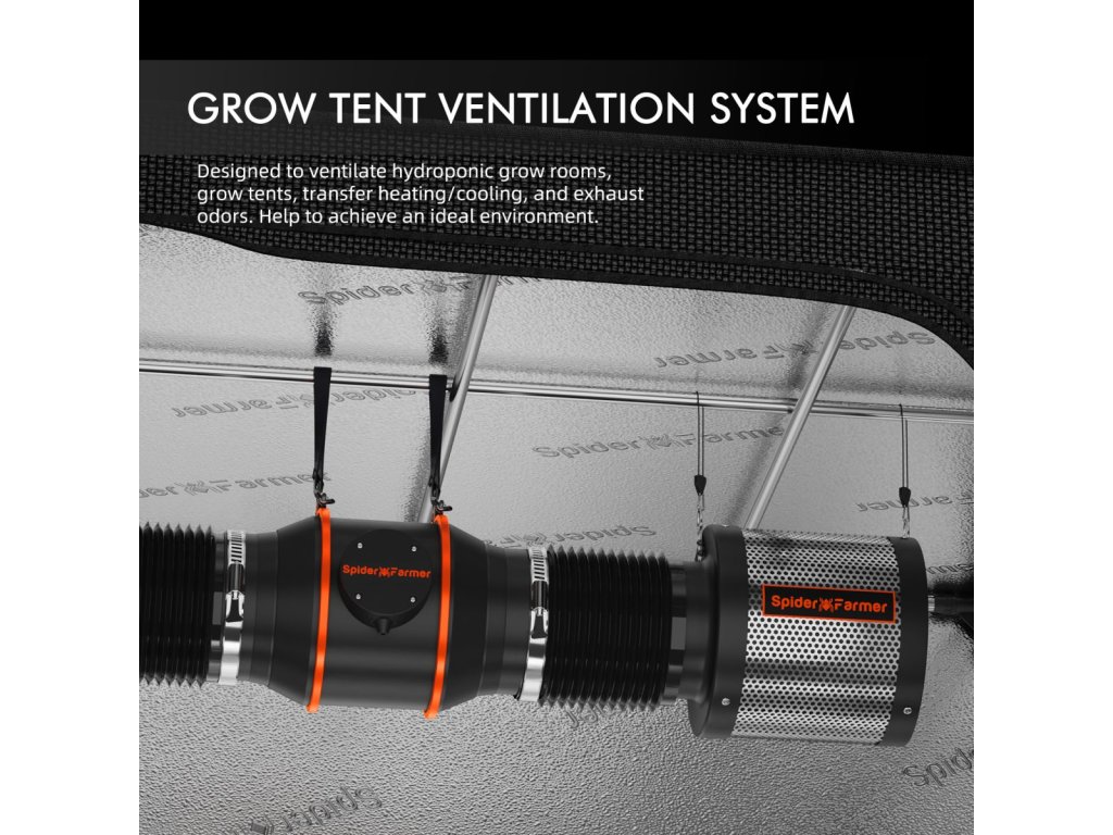 Spider Farmer 152mm Inline ventilátor, uhlíkový filter a regulátor otáčok