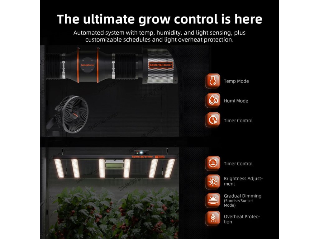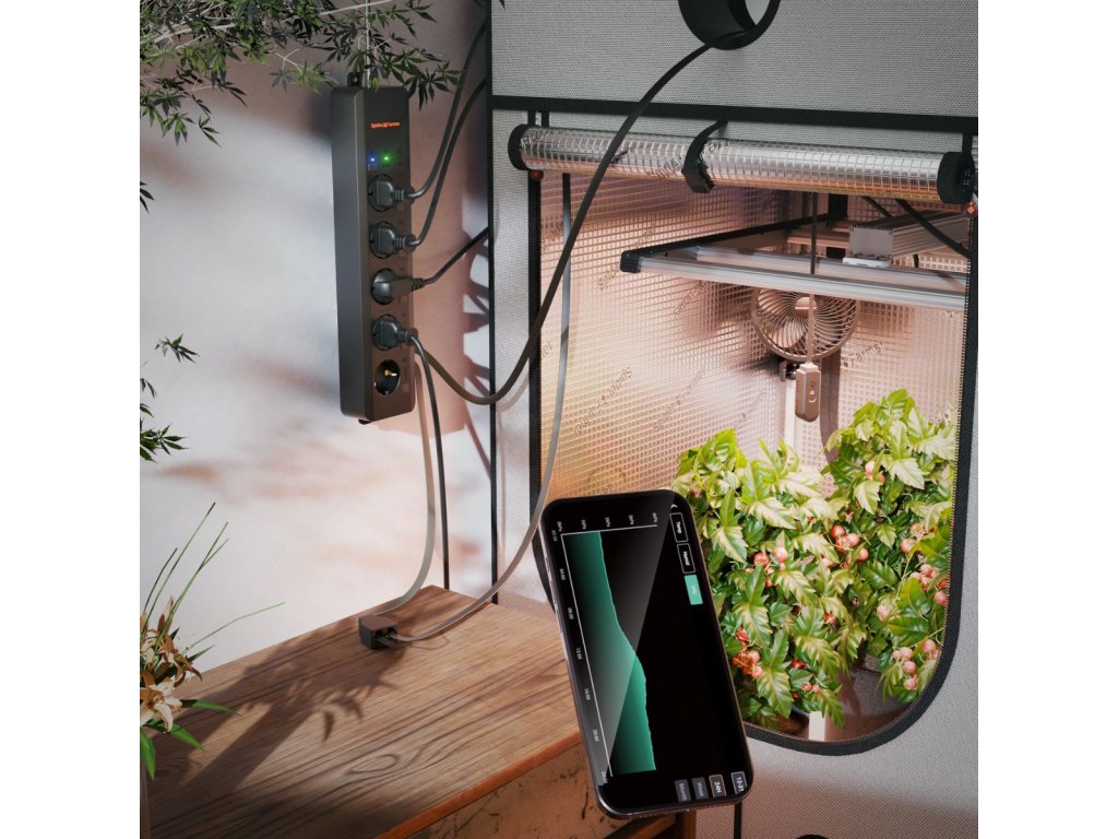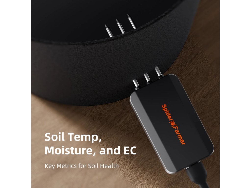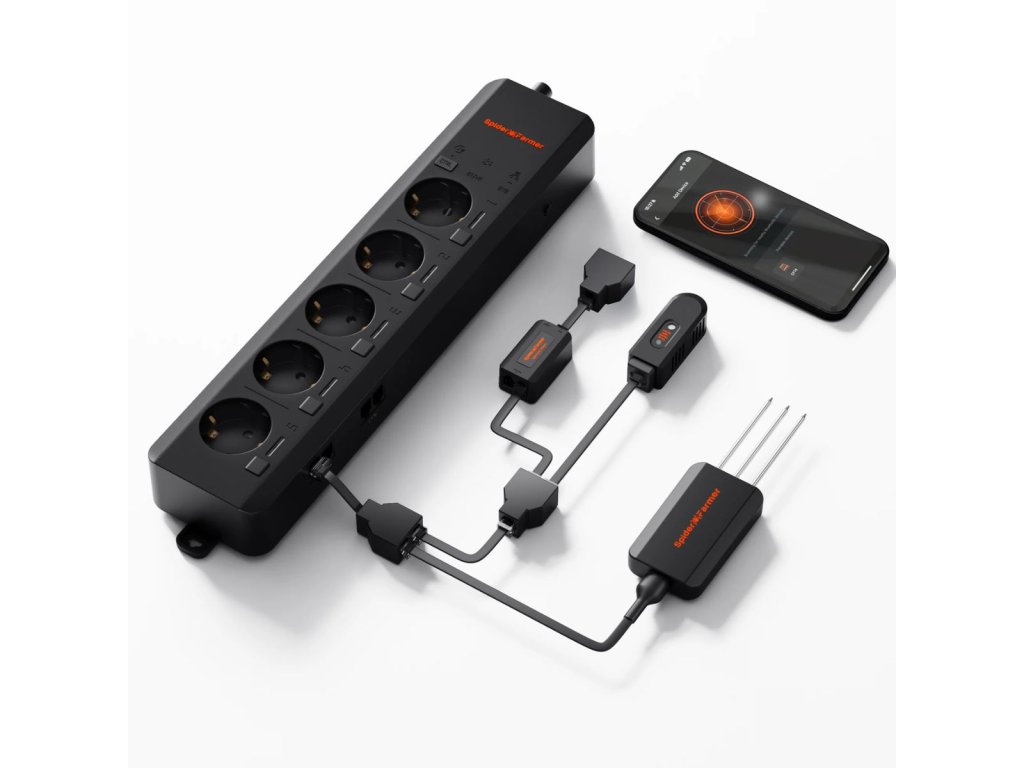 GGS AC5 ponúka 5 nezávislých zásuviek na napájanie a ovládanie maximálne 5 zariadení. Pomocou aplikácie Spider Farmer môžete na diaľku ovládať LED svetlá SF, G a SE Series, ventilátory s RJ12 portom a ďalšie zariadenia. Táto sada podporuje automatizáciu pre optimálne podmienky s nastaveniami pre teplotu, vlhkosť, CO2 a časové plány. 3-v-1 senzor pre pôdu meria vlhkosť, teplotu a elektrickú vodivosť pre zdravý rast rastlín.