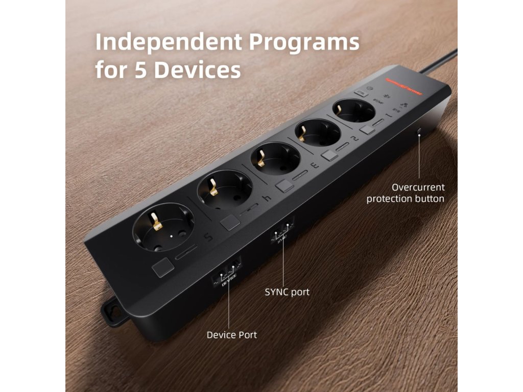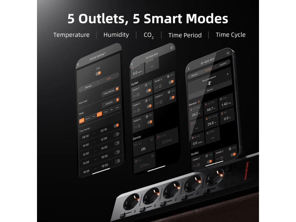 GGS AC5 je rozbočovač so 5 nezávislými zásuvkami, ktorý umožňuje ovládať až 5 zariadení. Prostredníctvom aplikácie Spider Farmer môžete na diaľku ovládať LED svetlá rady SF (okrem modelov SF1000D, SF300, SF600), G a SE Series. RJ12 ventilátory umožňujú nastavenie časovača, rýchlosti a oscilačných funkcií, zatiaľ čo ventilátory bez RJ12 portu sa dajú ovládať pomocou časovača.