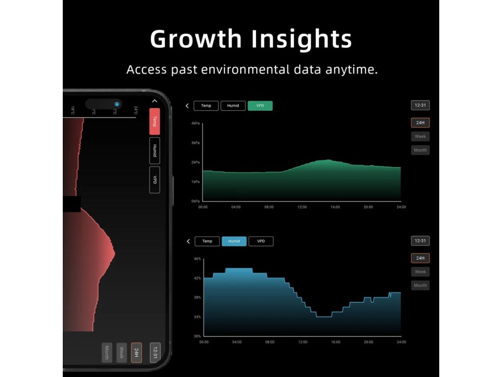 - Teplota, vlhkosť, VPD a CO2: Sledujte a optimalizujte podmienky pre rast s presnými hodnotami teploty, vlhkosti a VPD. (CO2 merací senzor nie je súčasťou balenia).