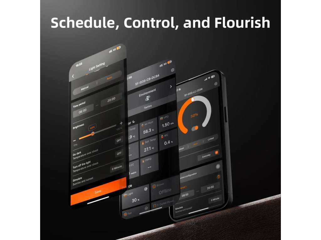 Inteligentné riadenie pestovateľského prostredia Spider Farmer GGS Controller umožňuje automatizáciu riadenia teploty, vlhkosti a osvetlenia vo vašom pestovateľskom stane. Je kompatibilný s rastovými svetlami série SF, G a SE Series a ventilátormi s RJ12 portom. Pomocou aplikácie Spider Farmer môžete zariadenie ovládať na diaľku, nastavovať časové plány, upravovať jas a simulovať prechody medzi východom a západom slnka.