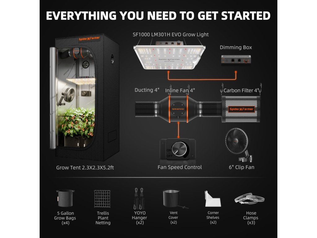 - 1× SF-1000 301H EVO Full Spectrum LED Grow Light: Toto LED svetlo ponúka pôsobivých 3,14 µmol/J PPE na diódu.