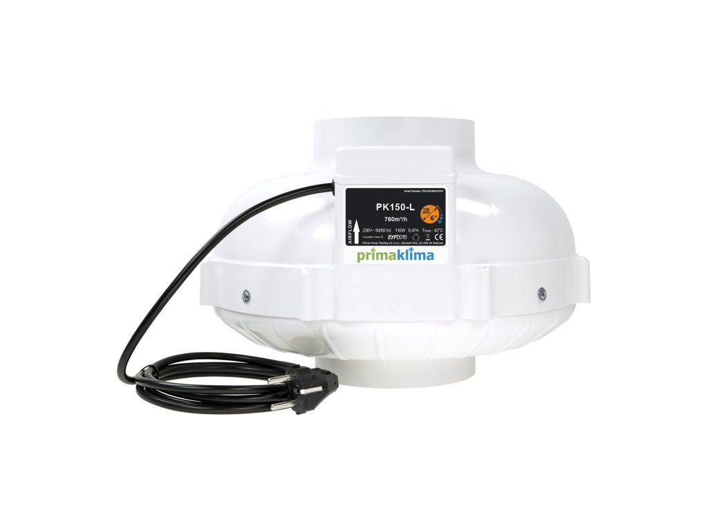 Prima Klima PK150-L je vysoko efektívny potrubný ventilátor s výkonom až 760 m3/h, vybavený kvalitným AC motorom ebm-papst s lopatkami zakrivenými dozadu. Vďaka aerodynamicky optimalizovanej konštrukcii dosahuje vysokého tlaku pri nízkej hlukovej úrovni. Odolný kryt z nehorľavého polyamidu zabezpečuje dlhú životnosť a bezpečnú prevádzku. Bezúdržbové ložiská s guľôčkovými ložiskami prispievajú k plynulému a tichému chodu.