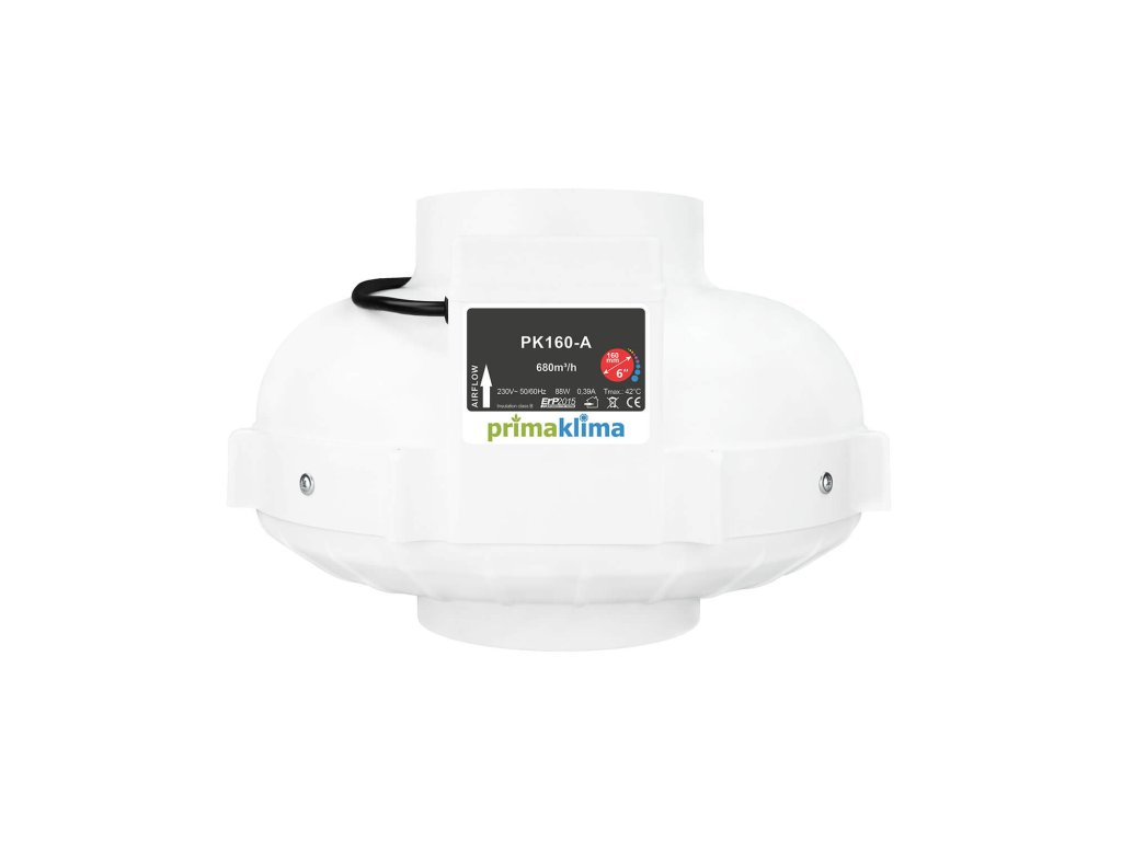 Prima Klima PK160-A je mimoriadne efektívny potrubný ventilátor vybavený AC motorom ebm-papst so zadne zakrivenými lopatkami. Celý kryt je vyrobený z nárazovzdorného a nehorľavého polyamidu (nylonu). Bezúdržbové guľôčkové ložiská zabezpečujú tichý a hladký chod motoru. Ventilátor je ideálny pre efektívnu a spoľahlivú ventiláciu.Ventilátor zvláda maximálny prietok 680 m3/hpri príkone 88W.)