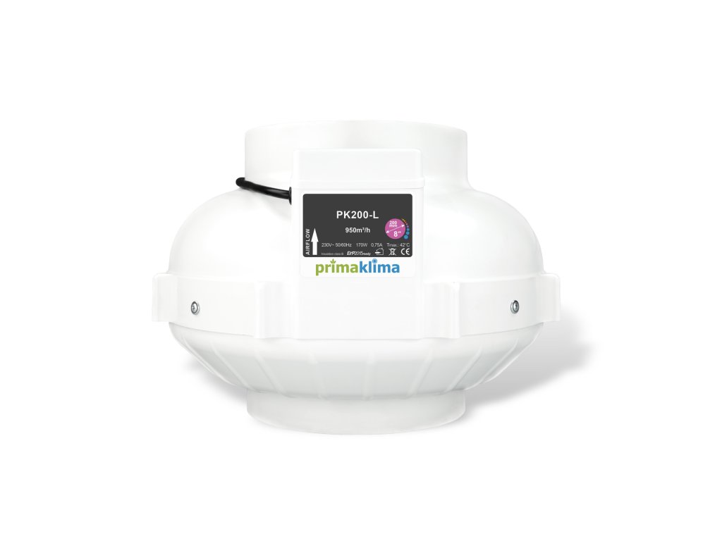 Prima Klima PK200-L je efektívny potrubný ventilátor s priemerom 200 mm, vybavený AC motorom ebm-papst s dozadu zakrivenými lopatkami, optimalizovanými pre konštrukciu krytu. Ventilátor poskytuje vysoký prietok vzduchu až 950 m3/h pri príkone 170 W a je vhodný pre profesionálne inštalácie v potrubných systémach.