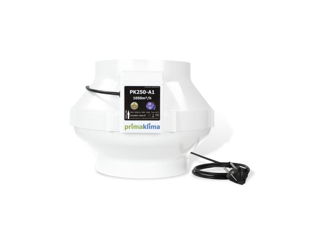 Prima Klima PK250-A1 je účinný potrubný ventilátor so 250 mm prírubou, vybavený AC motorom od ebm-papst s lopatkami zakrivenými dozadu, optimalizovanými pre konštrukciu krytu. Ventilátor poskytuje vysoký prietok vzduchu až 1050 m3/h pri príkone 120 W a je vhodný pre profesionálne inštalácie v potrubných systémoch.