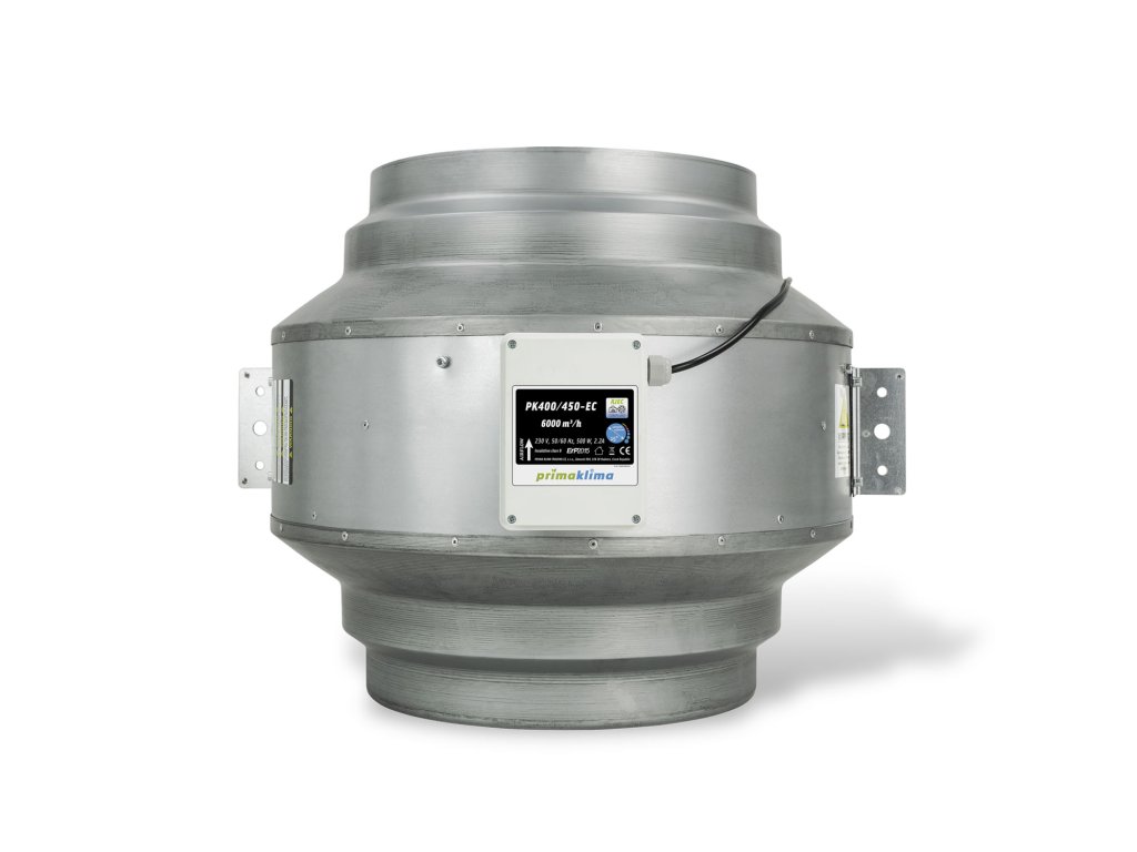 Prima Klima BLUE LINE PK400/450-EC je výkonný potrubný ventilátor s prírubou 400/450 mm, vybavený nemeckým motorom ebmpapst EC. Ventilátor zabezpečuje prietok vzduchu až 6000 m3/h a je určený pre nepretržitú prevádzku viac než 80 000 hodín. Vďaka nízkej hlučnosti a robustnej konštrukcii s predinštalovanými montážnymi uchyteniami je ideálny pre profesionálne inštalácie v potrubných systémoch.